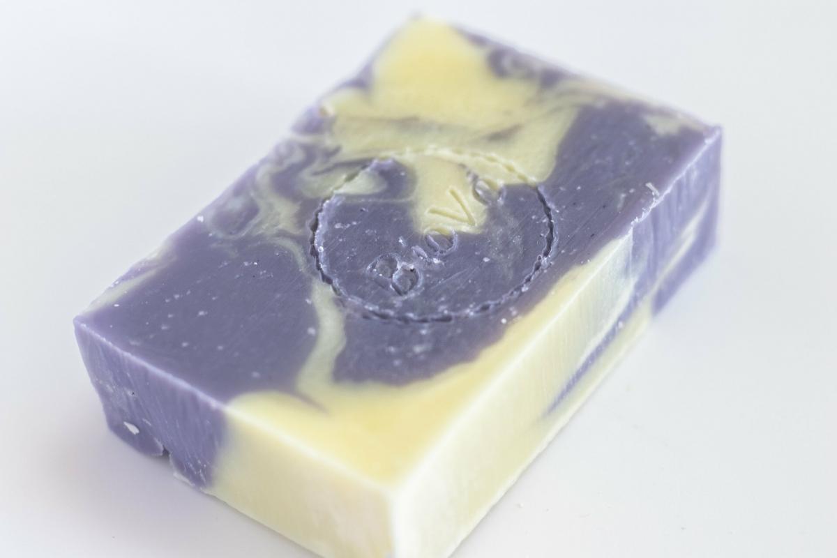 Ingredientes: Óleo de oliva, água, óleo de coco*, manteiga de cacau*, óleo de rícino, hidróxido de sódio, óleo essencial de alfazema, óleo essencial de árvore do chá e pigmento natural violeta. *Ingredientes de origem biológica