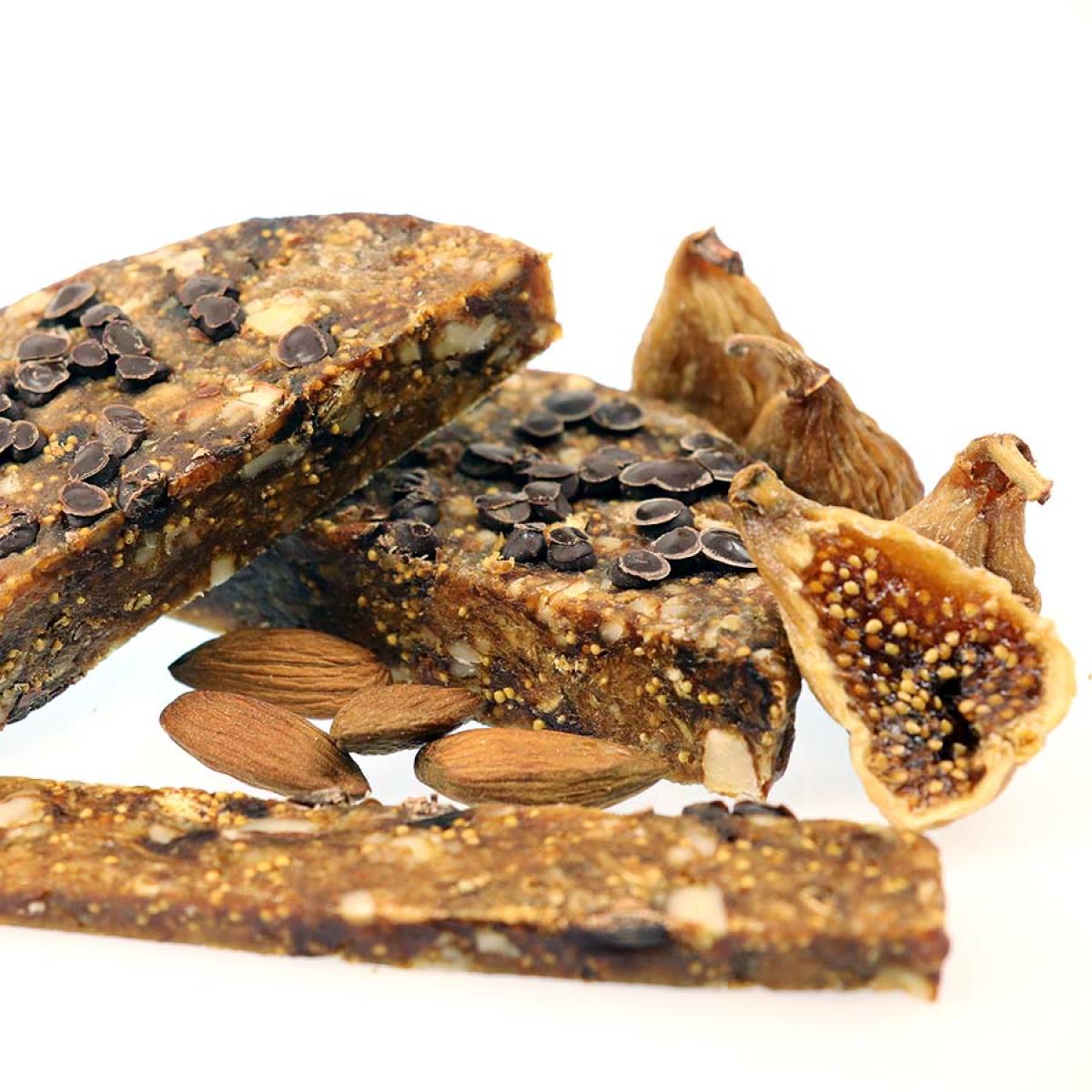 Ingredientes: Figos secos (Origem: Espanha) 90%, amêndoas 4%, gotas de chocolate (açúcar, pasta de cacau, manteiga de cacau, emulsificante (lecitina de girassol E-322) aroma natural de baunilha) 4%, canela e anis.