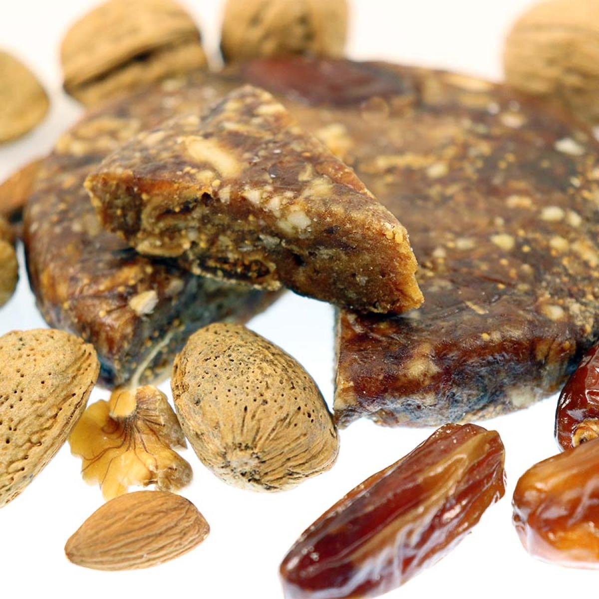 Ingredientes: Figo seco (Origem: Espanha) 60%, amêndoa, tâmara, ameixa, noz, canela e anis.